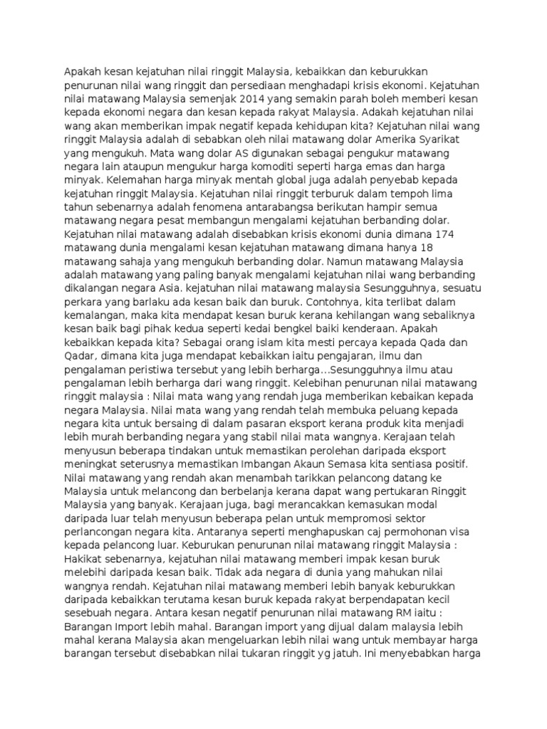 Apakah Kesan Kejatuhan Nilai Ringgit Malaysia from imgv2-2-f.scribdassets.com Kejatuhan nilai mata wang : Contextual translation of kesan kejatuhan nilai mata wang ringgit malaysia into english. Krisis ekonomi akibat gst dan kejatuhan nilai matawang. Satu ciri penting bagi matawang sesebuah negara ialah, mempunyai nilai yang boleh dijual beli dalam pasaran tukaran wang asing, dan matawang perlulah stabil untuk didagangkan. Keburukan penurunan nilai matawang ringgit malaysia. Ringgit malaysia ialah mata wang malaysia. Di brazil, pakar mencatatkan penurunan nilai mata wang negara yang sebenar berbanding mata wang amerika syarikat lebih daripada 20%. Satu ringgit terdiri daripada 100 sen.